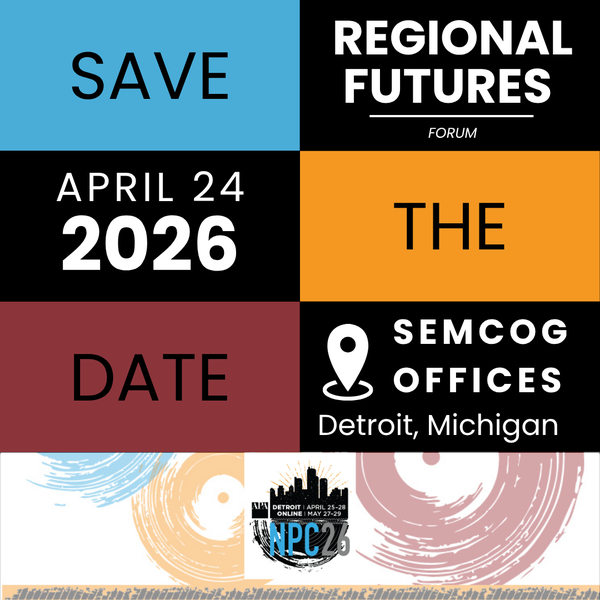 The 2026 Regional Futures Forum will be held at SEMCOG's offices in Detroit. The event will take place the Friday before the National Planning Conference so please plan to arrive one day early. Additional information will be made available prior the forum so stay tuned!